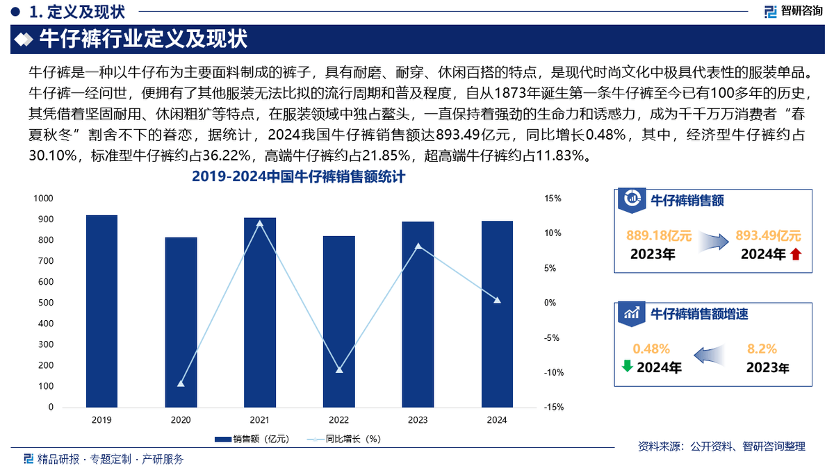 牛仔裤一经问世,便具有了其他服拆无法对比的风行周期和普及程度,自从1873年降生第一条牛仔裤至今已有100多年的汗青,其凭仗着坚忍耐用、休闲粗犷等特点,正在服拆范畴中夺得冠军,一曲连结着强劲的生命力和力,成为千千千万消费者“春夏秋冬”割舍不下的眷恋,据统计,2024我国牛仔裤发卖额达893。49亿元,同比增加0。48%,经济型牛仔裤约占30。10%,尺度型牛仔裤约占36。22%,高端牛仔裤约占21。85%,超高端牛仔裤约占11。83%,将来,跟着国平易近收入程度的提高和消费不雅念的改变,消费者对牛仔裤的质量、设想和品牌的要求也正在不竭提拔,这将鞭策牛仔裤行业向高端化、个性化标的目的成长,为企业带来更多的市场机遇。