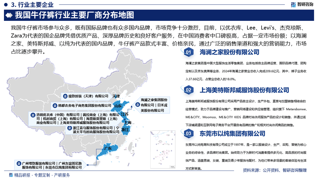 我国牛仔裤市场参取浩繁,既有国际品牌也有浩繁国内品牌,市场所作十分激烈,目前,以优衣库、Lee、Levis、杰克琼斯、Zara为代表的国企品牌凭仗优良产物、深挚品牌汗青和优良客户办事,正在中国消费者中口碑极高,占领必然市场份额;以海澜之家、美特斯邦威、以纯为代表的国内品牌,牛仔裤产物格式丰硕、价钱亲平易近,通过普遍的发卖渠道和强大的营销能力,市场占比逐渐攀升,电商平台兴起鞭策了线上品牌成长,戎美高端女拆、韩都衣舍等线上品牌,以快速响应和个性化定务吸引消费者。
