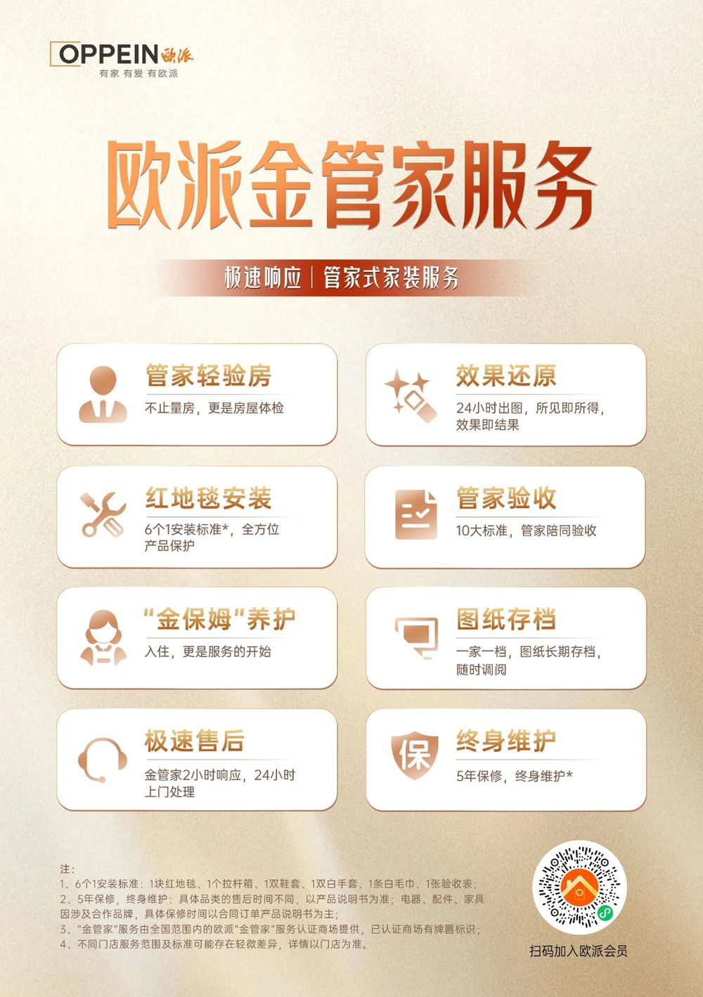 正在办事上,欧派一直逃求“用户至上”,独创“金管家办事”系统,从设想征询到终身,全程供给“超预期”办事体验,实正将质量从“出产端”延长到“用户体验端”。正在环保尺度上,欧派积极参取行业环保尺度制定,环保尺度率先达到ENF级,让整家绿色走进千家万户。