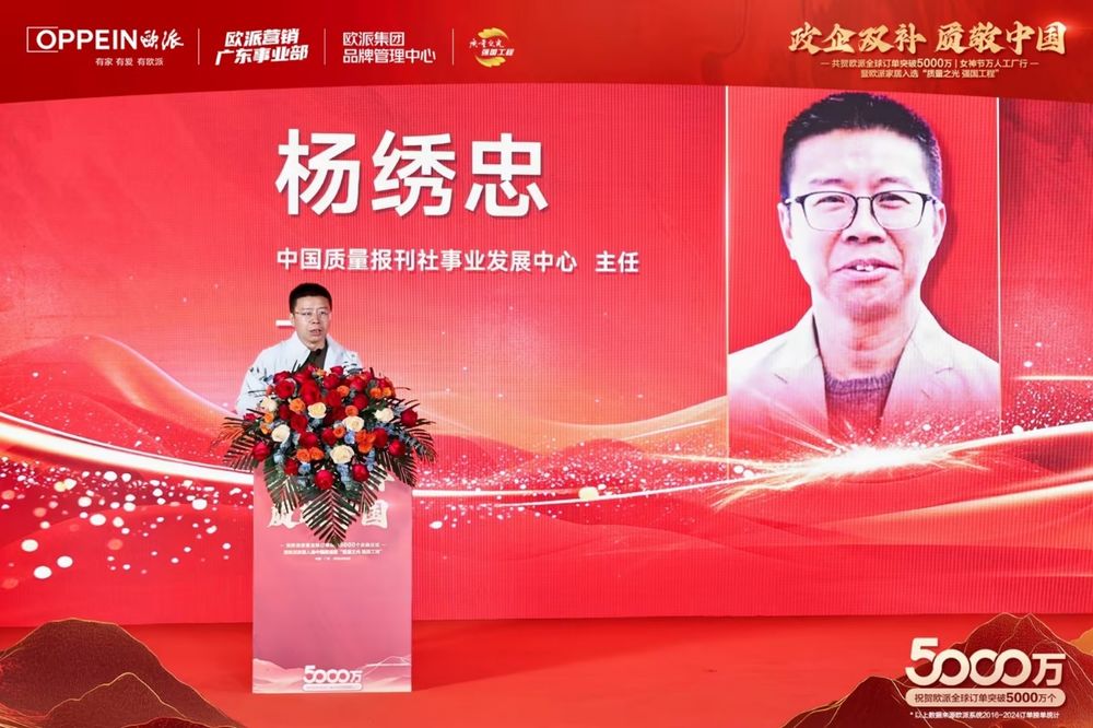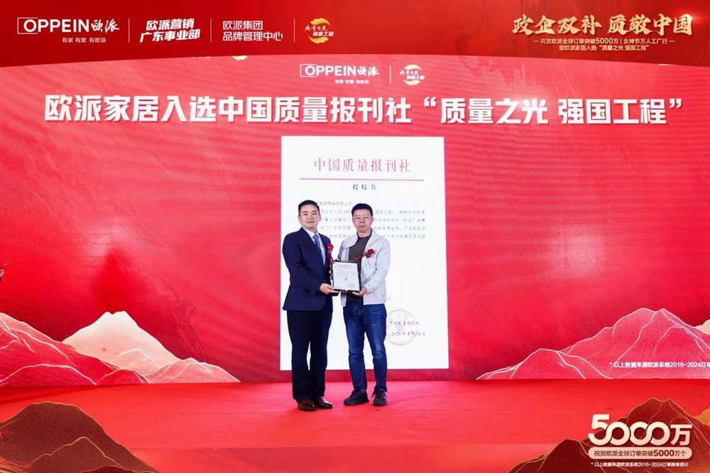 塑制质量标杆,成绩质量典型。全球5000万个订单的注目成就背后,是欧派“以质为基”的苦守从环保材料的全球优选,到整家无醛的守护;从智能化工场的细密制制,到每一道质检流程的严酷把控;从设想、成品展示,到终身办事的质量许诺,欧派用实力点亮世界的每一个角落。正如杨从任所言,正在扶植质量强国这个新起点,中国质量报刊社取欧派情投意合,欧派将以入选“质量之光?强国工程”为动力,汇聚每一份匠心,家居行业。庆典典礼现场,中国质量报刊社事业成长核心从任杨绣忠先生为欧派家居集团副董事长姚良柏姚总授予了“质量之光强国工程”荣誉殊荣。
