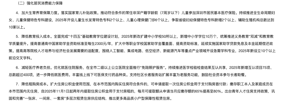 2025年6月6日,深圳市成长和委员会正式印发《深圳市提振消费专项步履实施方案》,提出扩大住房公积金利用范畴,合适前提的缴存人能够申请提取一次住房公积金用于领取购房首付款。此外,2025年11月1日起两年内,缴存职工本人及家庭正在本市范畴内无住房,提取该期间内住房公积金用于领取房租的,每月可提取额从申请当月应缴存额的65%阶段性提高至80%。