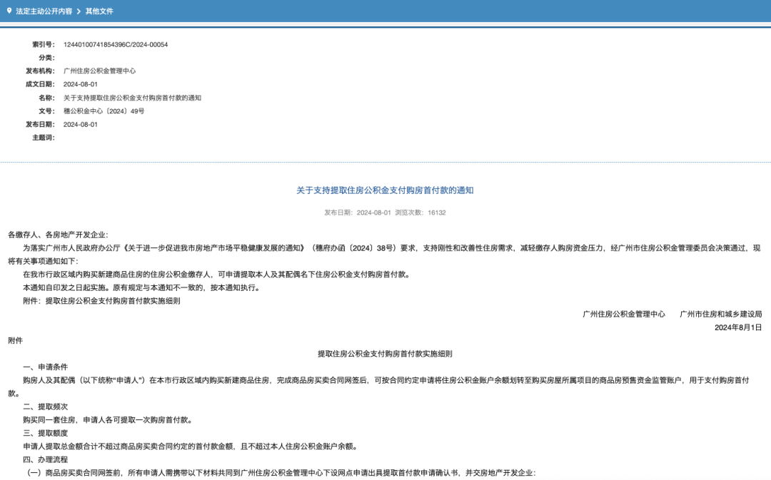2024年8月1日,广州住房公积金办理核心发布《关于支撑提取住房公积金领取购房首付款的通知》,明白购房人及其配头正在广州市行政区域内采办新建商品住房,完成商品房买卖合同网签后,可按合同商定申请将住房公积金账户余额划转至采办衡宇所属项目标商品房预售资金监管账户,用于领取购房首付款。